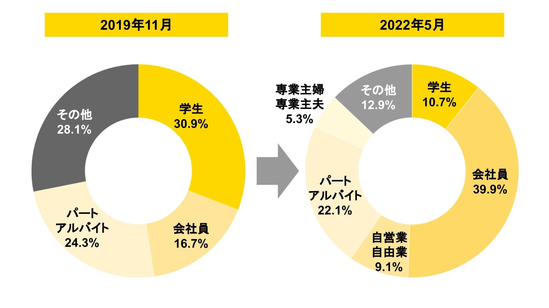 本調査の結果、2022年になってから「タイミー」で副業を始めた人が65.4%いることや、過去調査(*)にて「タイミー」を利用する働き手の属性の変化として、会社員が全体に占める割合は16.7%(2019年11月)から、39.9%(2022年5月)に増加しているなど、副業目的で利用する会社員の働き手の割合が増加していることがわかりました。