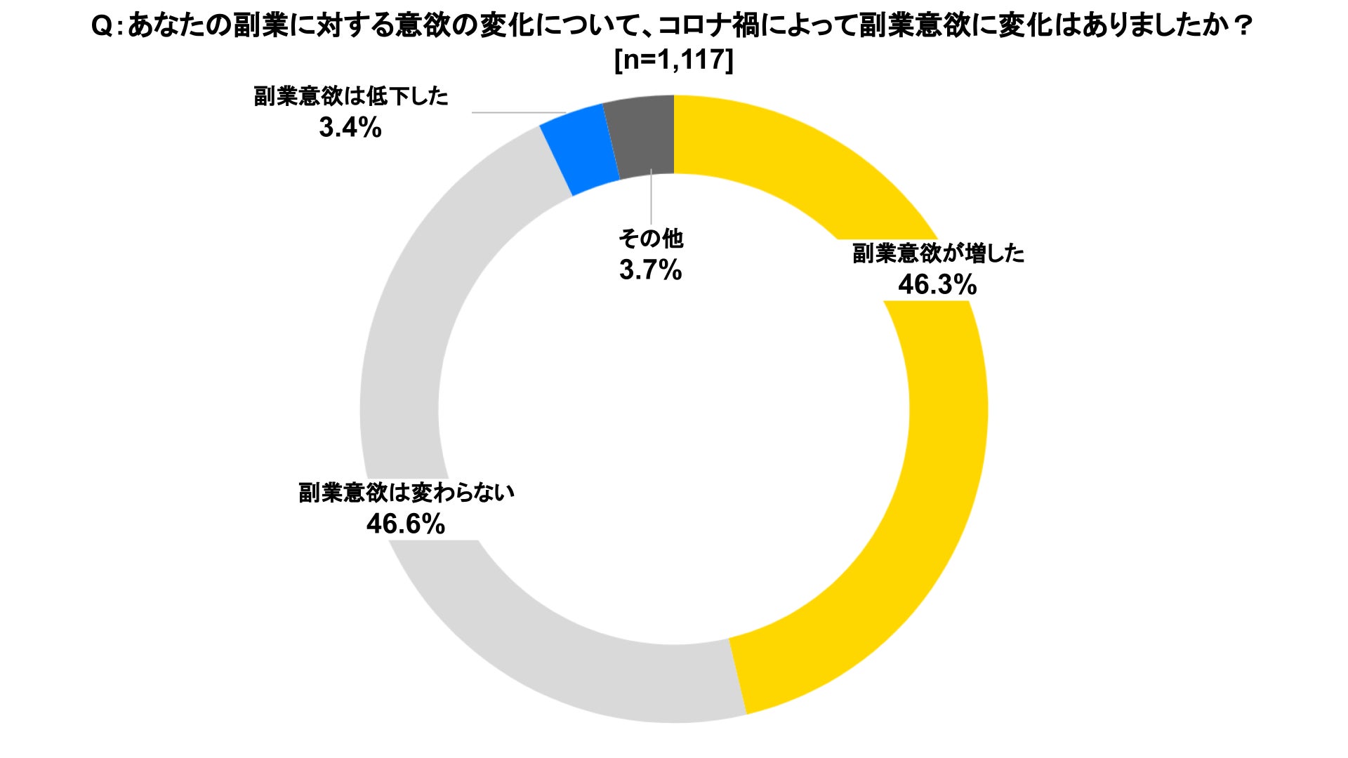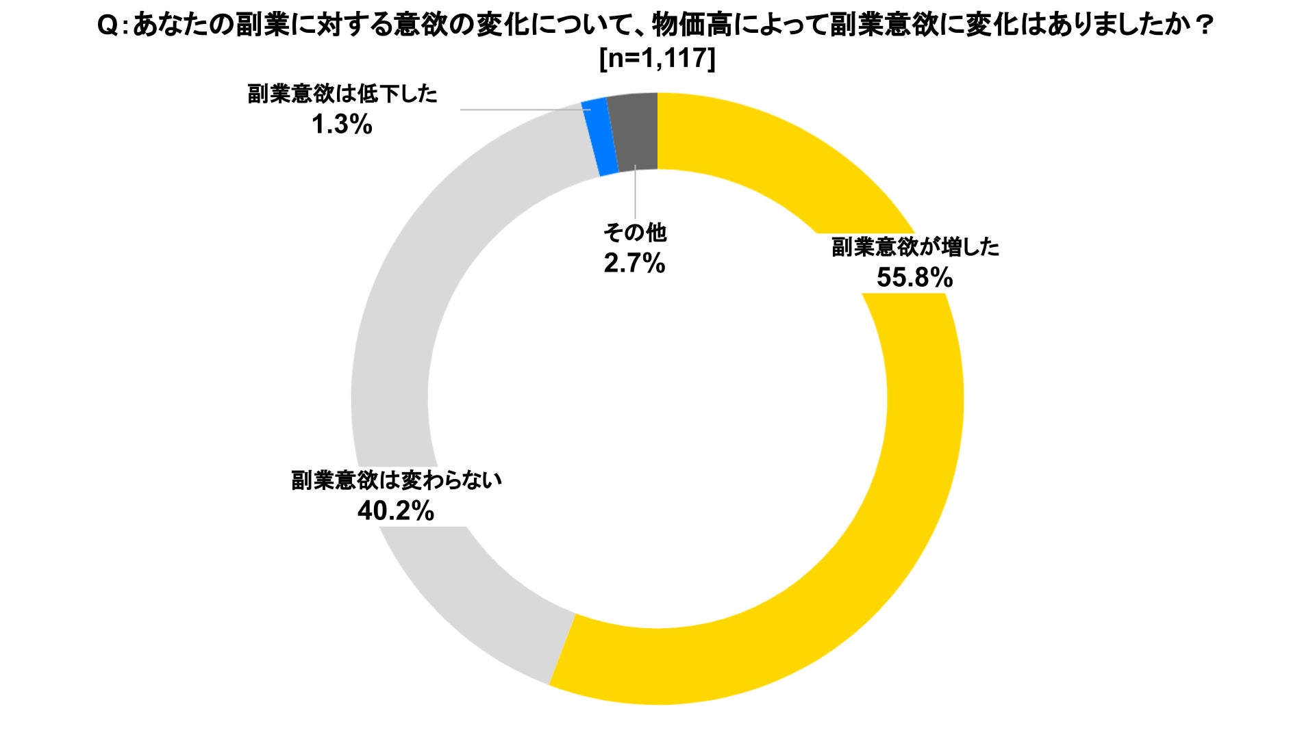 副業意欲の変化については、“コロナ禍”や“物価高”によって「副業意欲が増した」と回答した方が約半数になった。“コロナ禍”と“物価高”を比べると、“物価高”の方が、9.5ポイント副業意欲に与えた影響が大きいことがわかった。