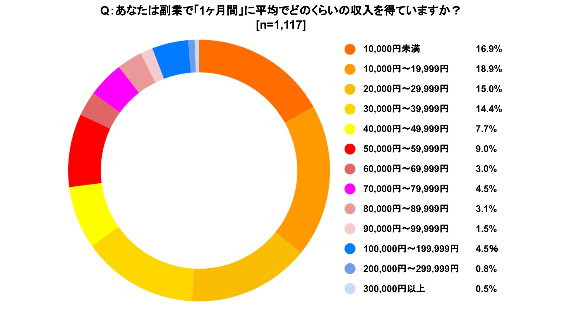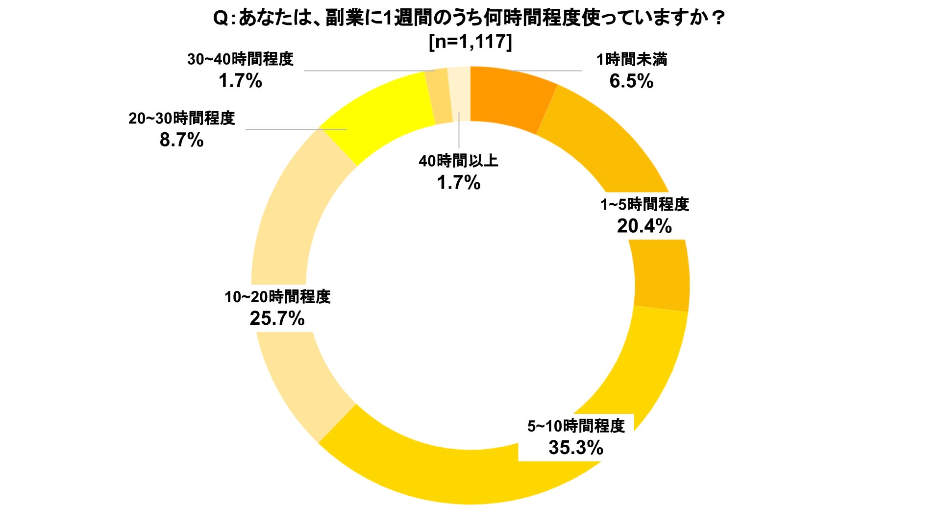 副業による収入の中央値は20,000円〜29,999円(1ヶ月あたり)で、副業にあてている時間の中央値は、5〜10時間程度(1週間あたり)となった。