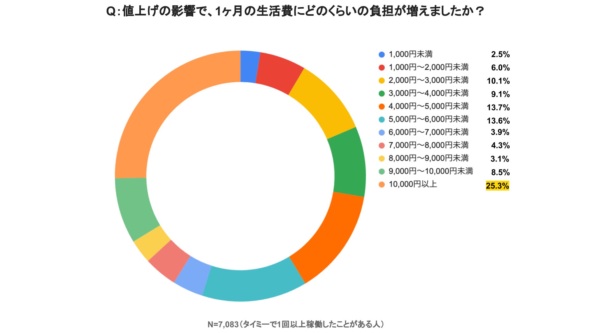 値上げの影響により、1ヶ月の生活費が10,000円以上が増えたと回答した人は25.3%で、前回の調査結果から6.2ポイント増加し、初めて20%を超えた。