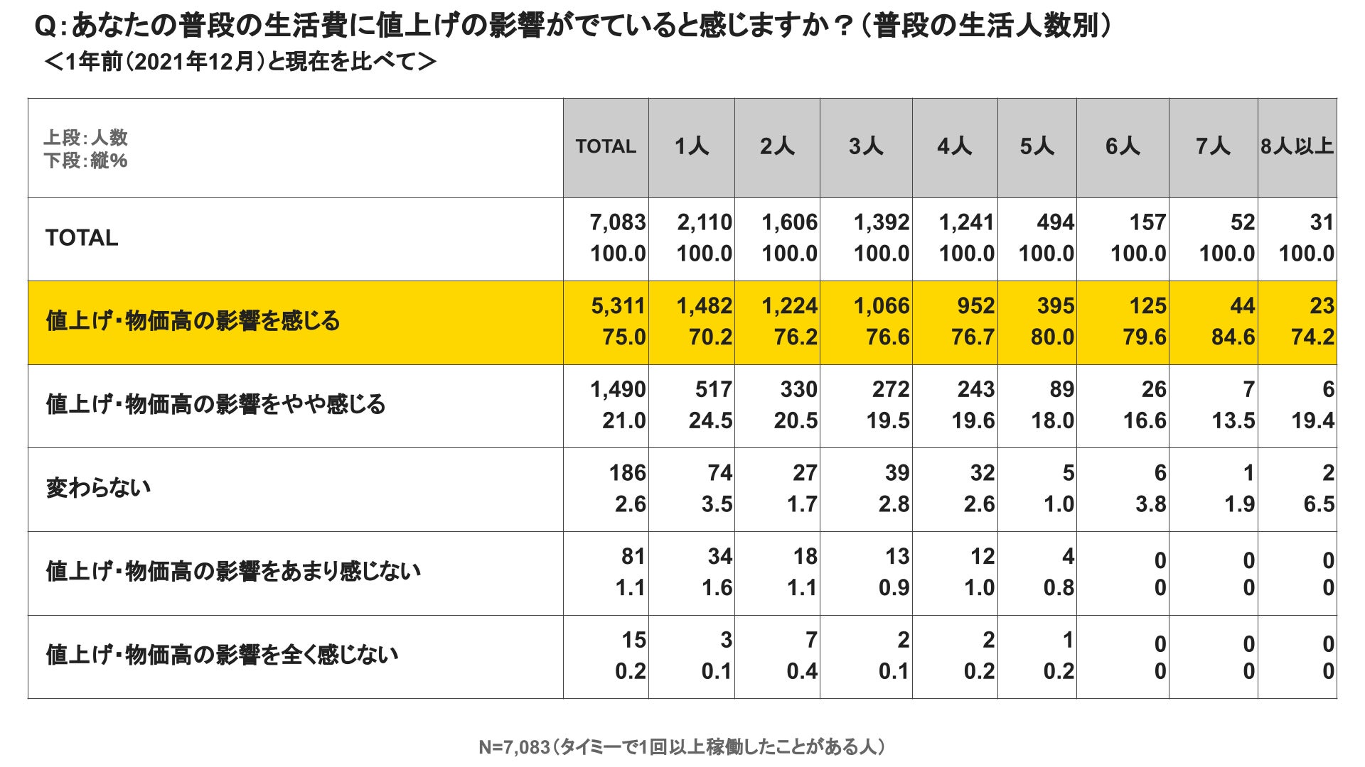 なお、生活している人数が多い世帯ほど、値上げ・物価高の影響を感じる割合が高い傾向が確認された。