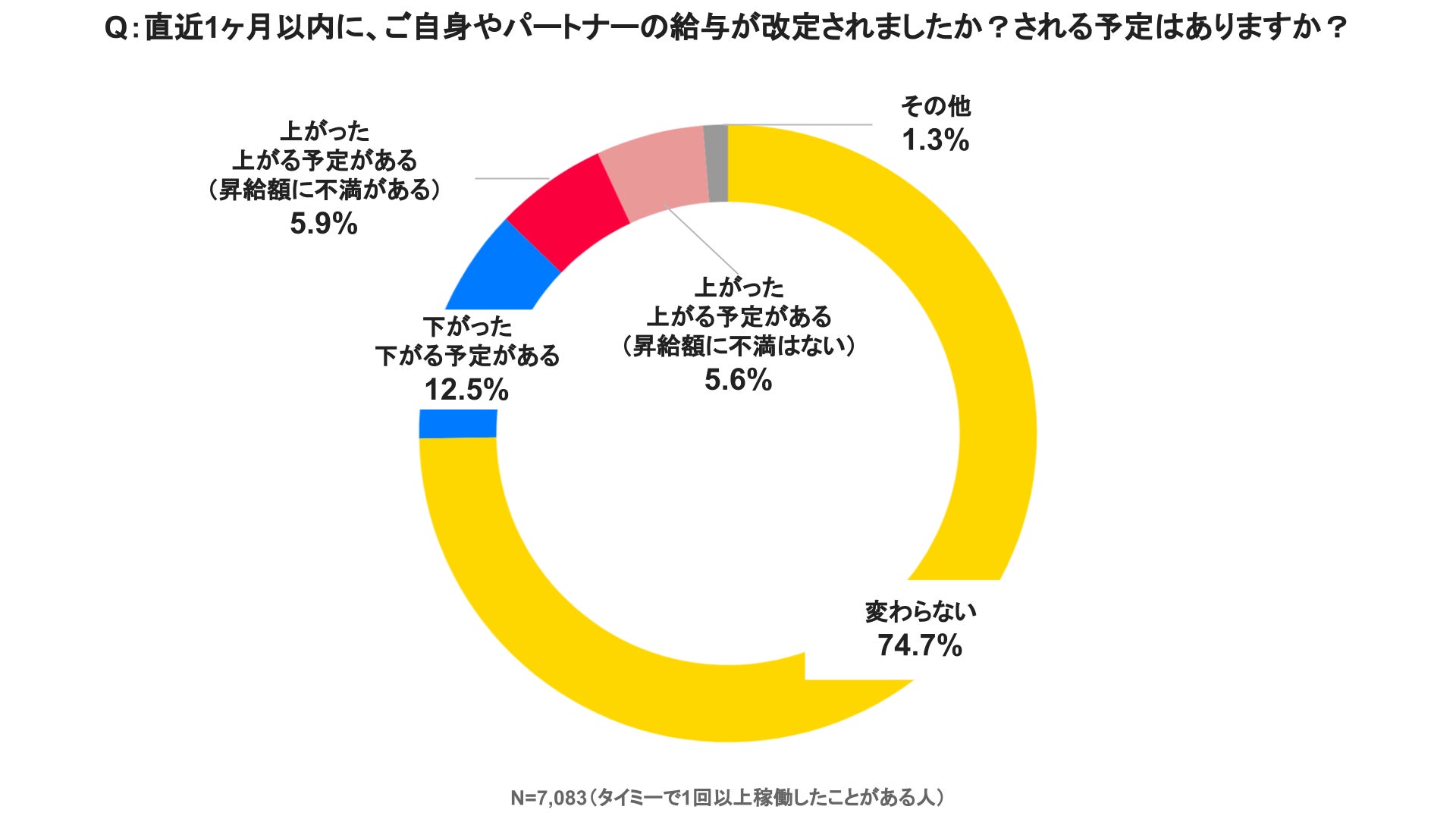 支出が増え家計の負担は増える一方だが、“直近1ヶ月以内の給与改定”についての質問への回答では、「変わらない(74.7%)」、「下がった・下がる予定がある(12.5%)」と、「上がった・上がる予定がある(5.6%)」は少ない現状も確認された。