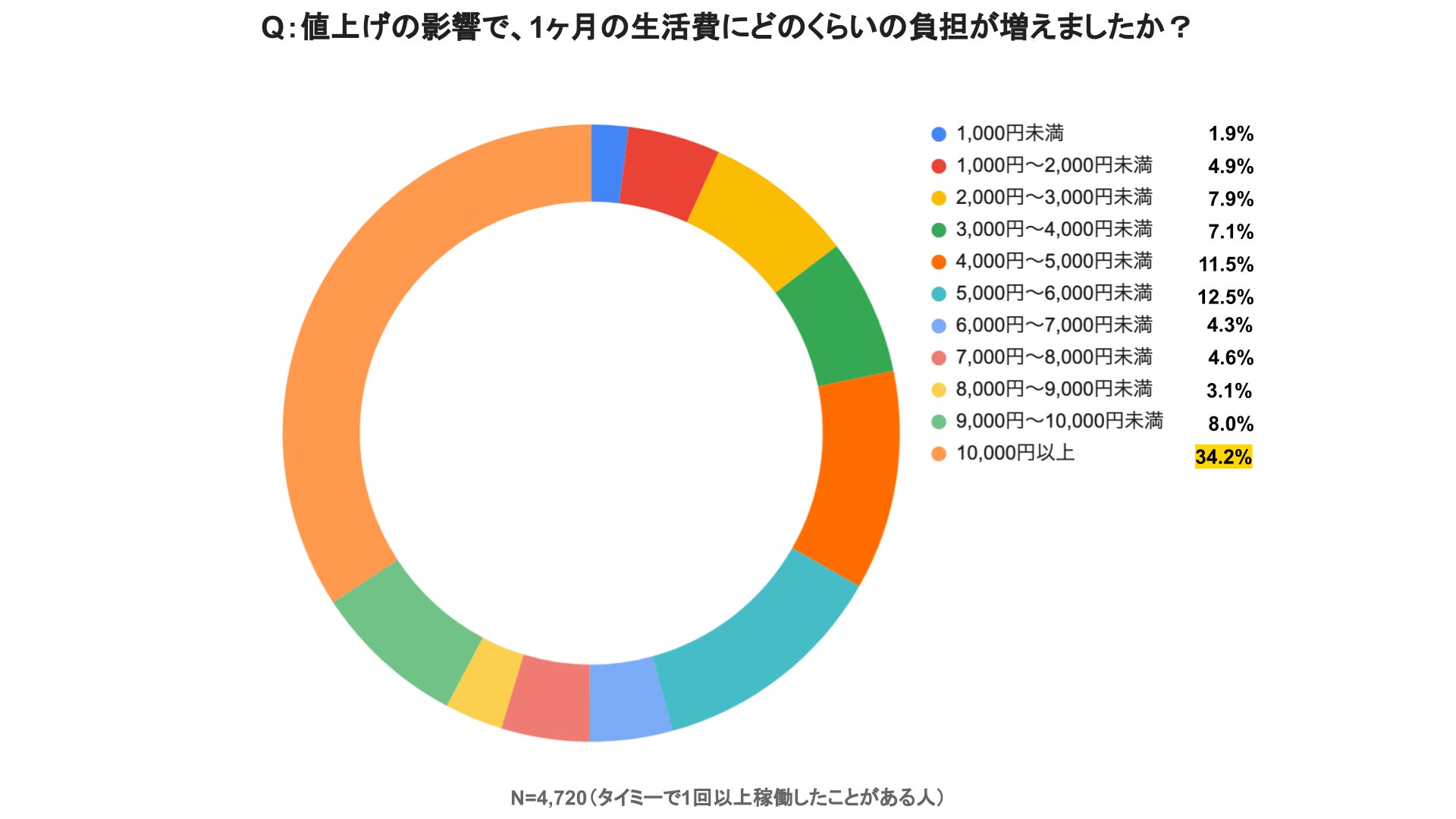 - 値上げの影響により、一月の生活費が10,000円以上が増えたと回答した人は34.2%で、