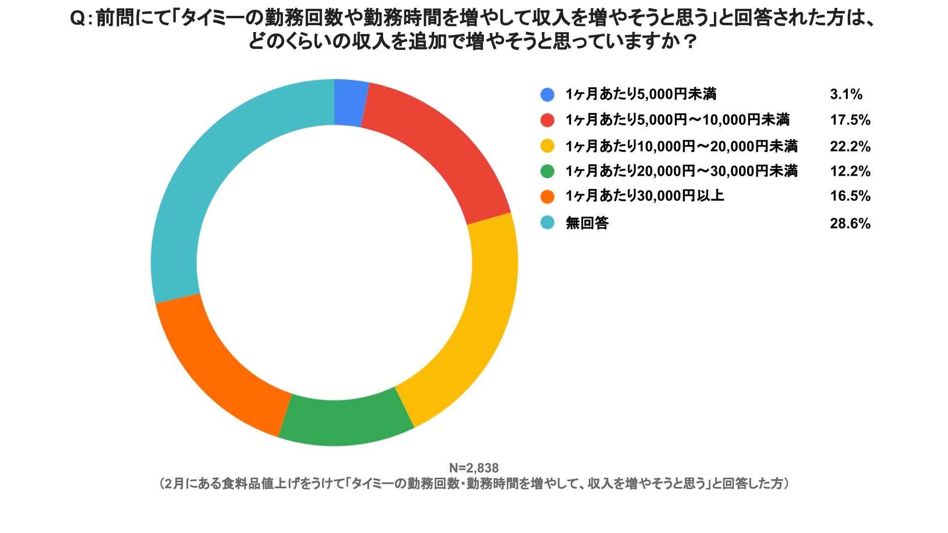 2月に予定されている5,400品目を超える食品の値上げ報道(*1)を受けて「タイミーの勤務回数や時間を増やして収入を増やそうと思う」と回答した人は60%を超えた。また、追加で増やそうと思っている金額としては、無回答者を除くと10,000円〜20,000円未満と回答した人が22.2%と最も多くなった。