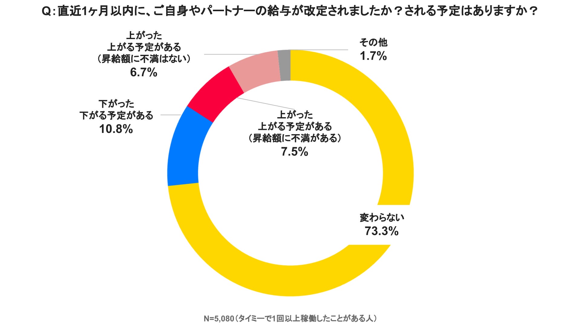 支出が増え家計の負担は増える一方だが、“直近1ヶ月以内の給与改定”についての質問への回答では、「変わらない(73.3%)」、「下がった・下がる予定がある(10.8%)」となり、値上げ・物価高に伴う支出増を感じる方の多さと比較して、収入増となっていない方が多くいることが確認された。