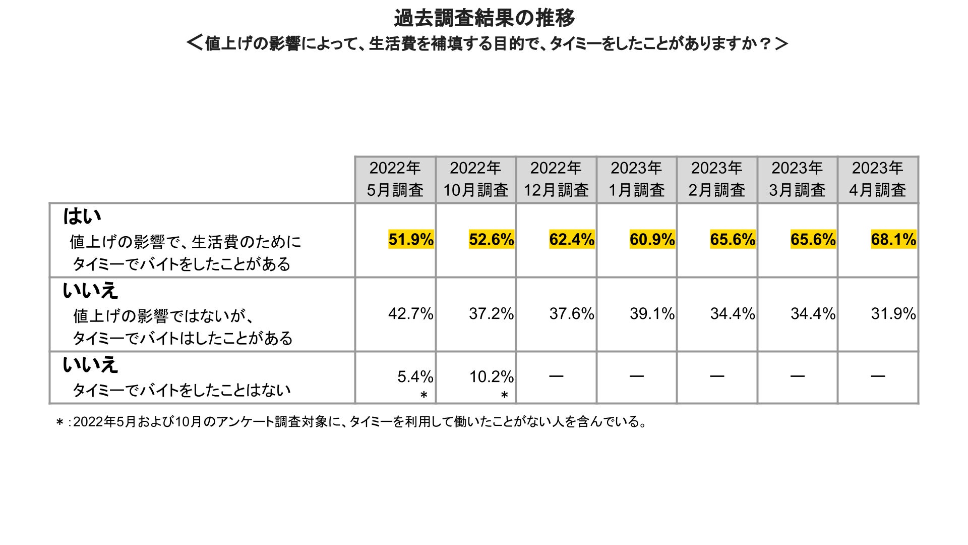 スキマバイトサービス「タイミー」を提供する株式会社タイミー(所在地:東京都港区、代表取締役:小川 嶺)は、「タイミー」に登録している働き手5,080名を対象に、生活者にとって大きな関心事になっている「物価高・値上げ」と「スキマバイト」に関する実態調査の第7回目の調査(過去6回の調査結果は末尾参照)を実施いたしました。