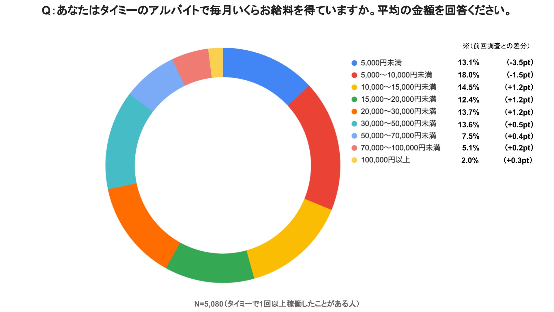 タイミーのスキマバイトで得た一月あたりの収入については、「5,000円未満」「5,000〜10,000円未満」「10,000〜15,000円未満」「15,000〜20,000円未満」「20,000〜30,000円未満」「30,000〜50,000円未満」がいずれも10%台の回答となり、スキマバイトの“自分のすきな時間に働ける”という特徴が伺え、多様なライフスタイルから支持されていることが推察される。また、1万円以上の収入を得ている人は70%弱おり、1万円以上増えた生活費負担がスキマバイトの収入で補われていることも伺える。