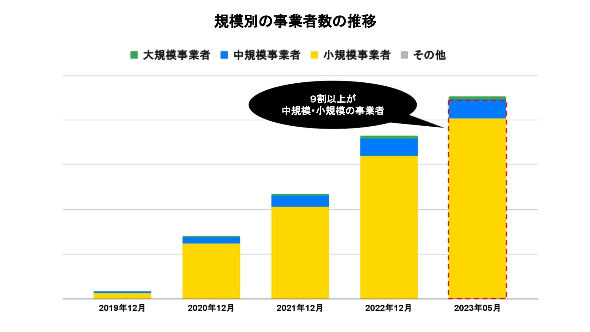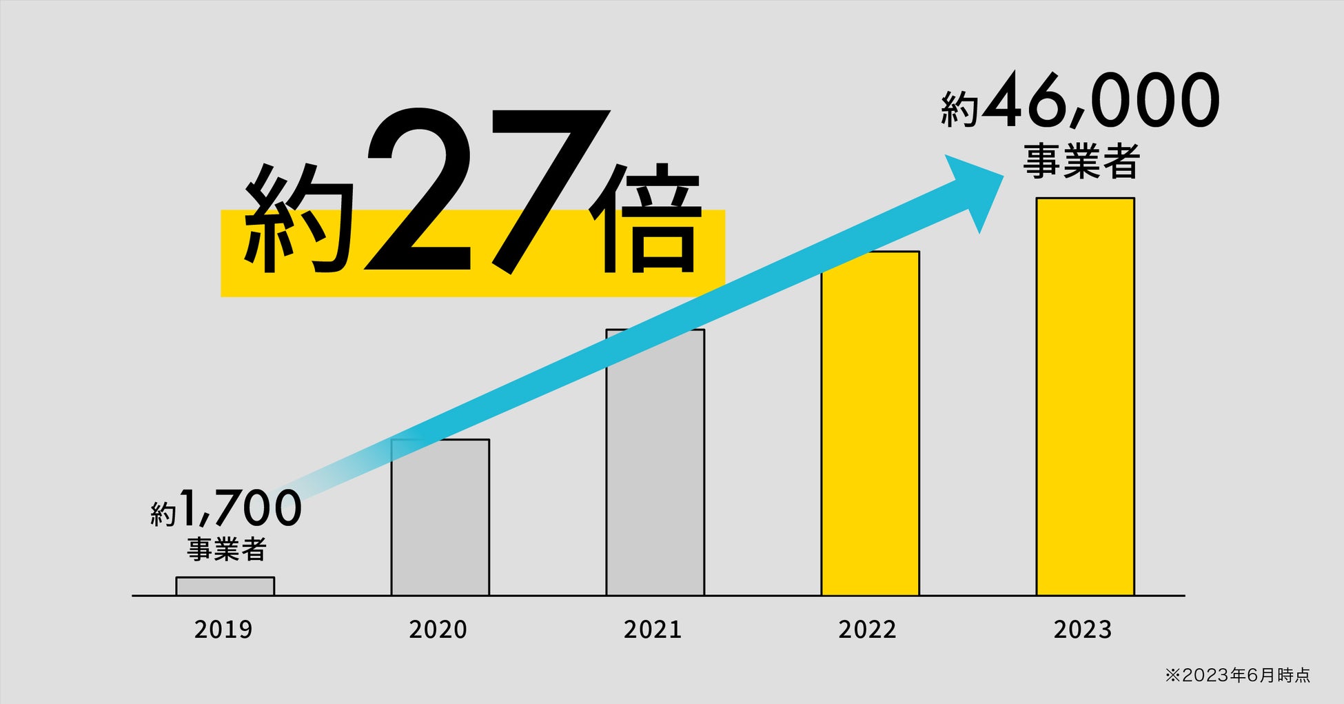 ワーカー数同様に、事業者数、事業所数も順調に増加しており、2019年比では、事業者数は約27倍、事業所数は約16倍となりました。