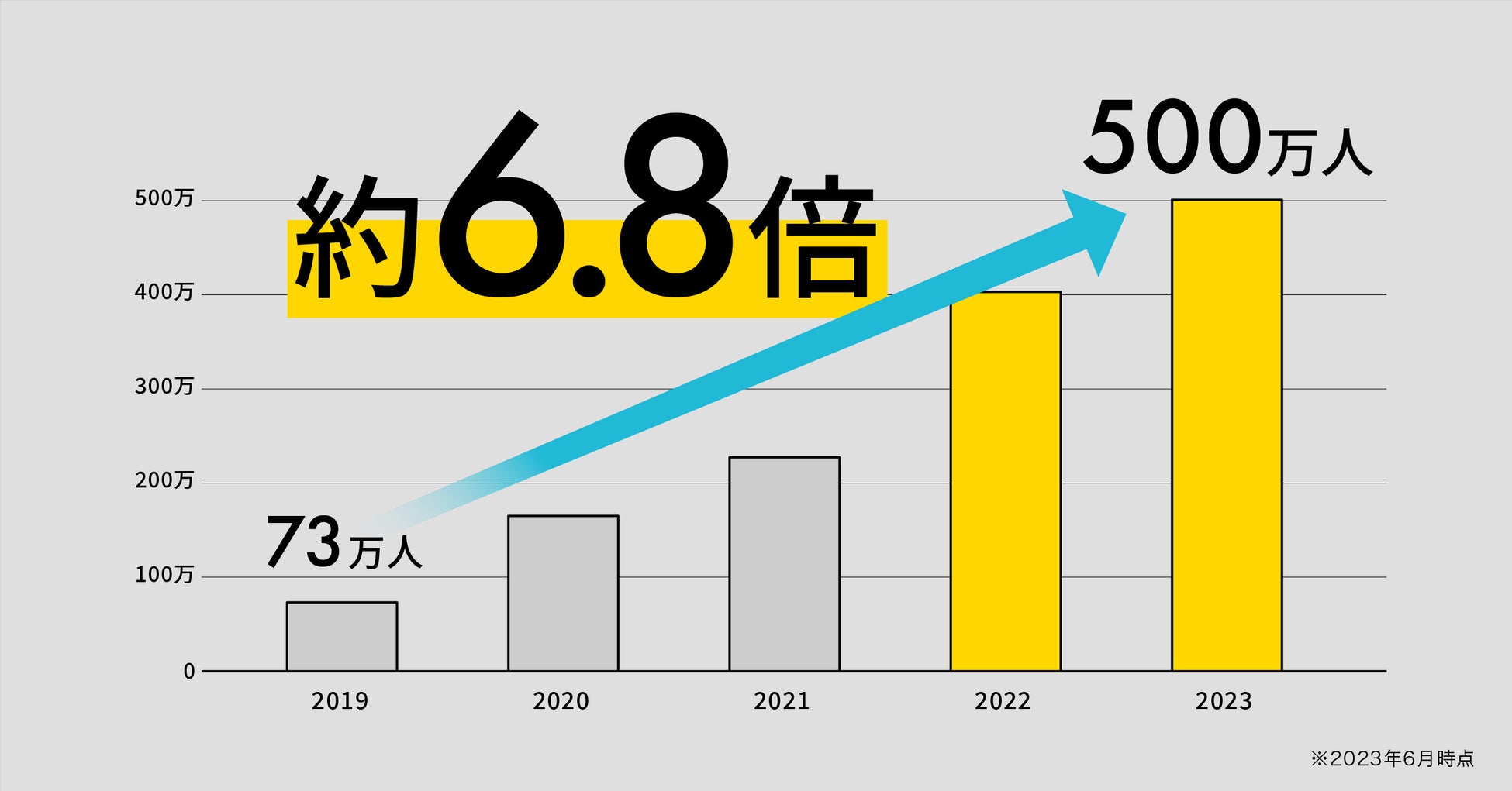 タイミーに登録しているワーカー数は2019年末時点の73万人から、5年間で約6.8倍に増加しました。2023年1月には400万人を記録。そこから約半年で100万人増加し、今回の500万人突破に至りました。