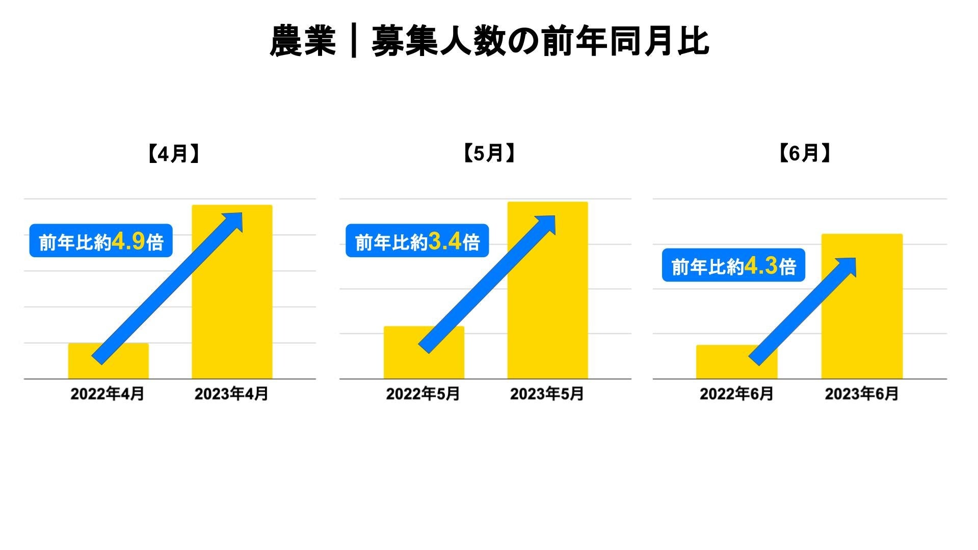 また、直近3ヶ月の募集人数の前年同月比を見てみると2023年4月は約4.9倍、2023年5月は約3.4倍、2023年6月は約4.3倍となり、農業の現場でタイミーの活用が広がっていることがわかります。
