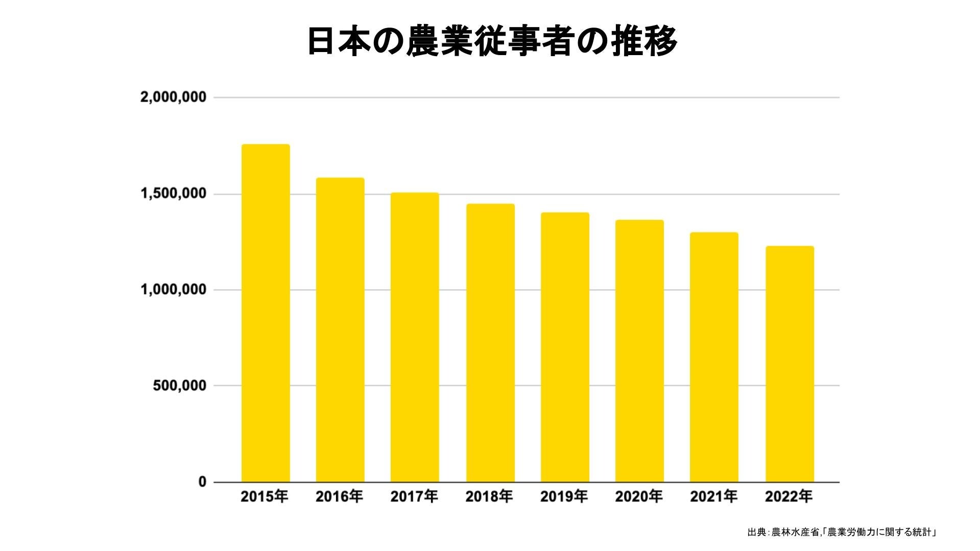 日本における農業従事者数は減少傾向が続いており(※1)、その背景には雇用機会の拡大による都市部への人口流出や農業従事者の高齢化などが指摘されています。