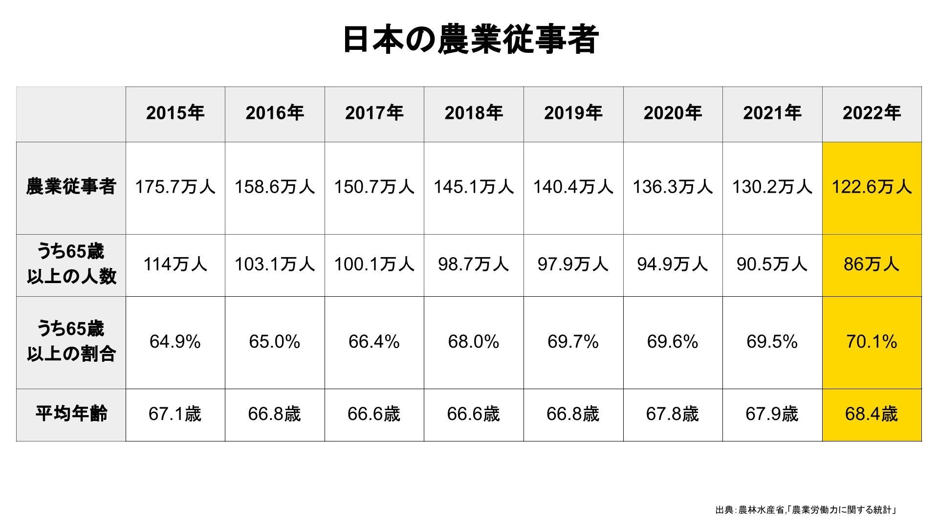 日本における農業従事者数は減少傾向が続いています。2022年の農業従事者は122.6万人で、そのうち65歳以上が占める割合は70.1%(※1)と、日本の農業従事者の人手不足と高齢化の課題が浮き彫りとなっています。