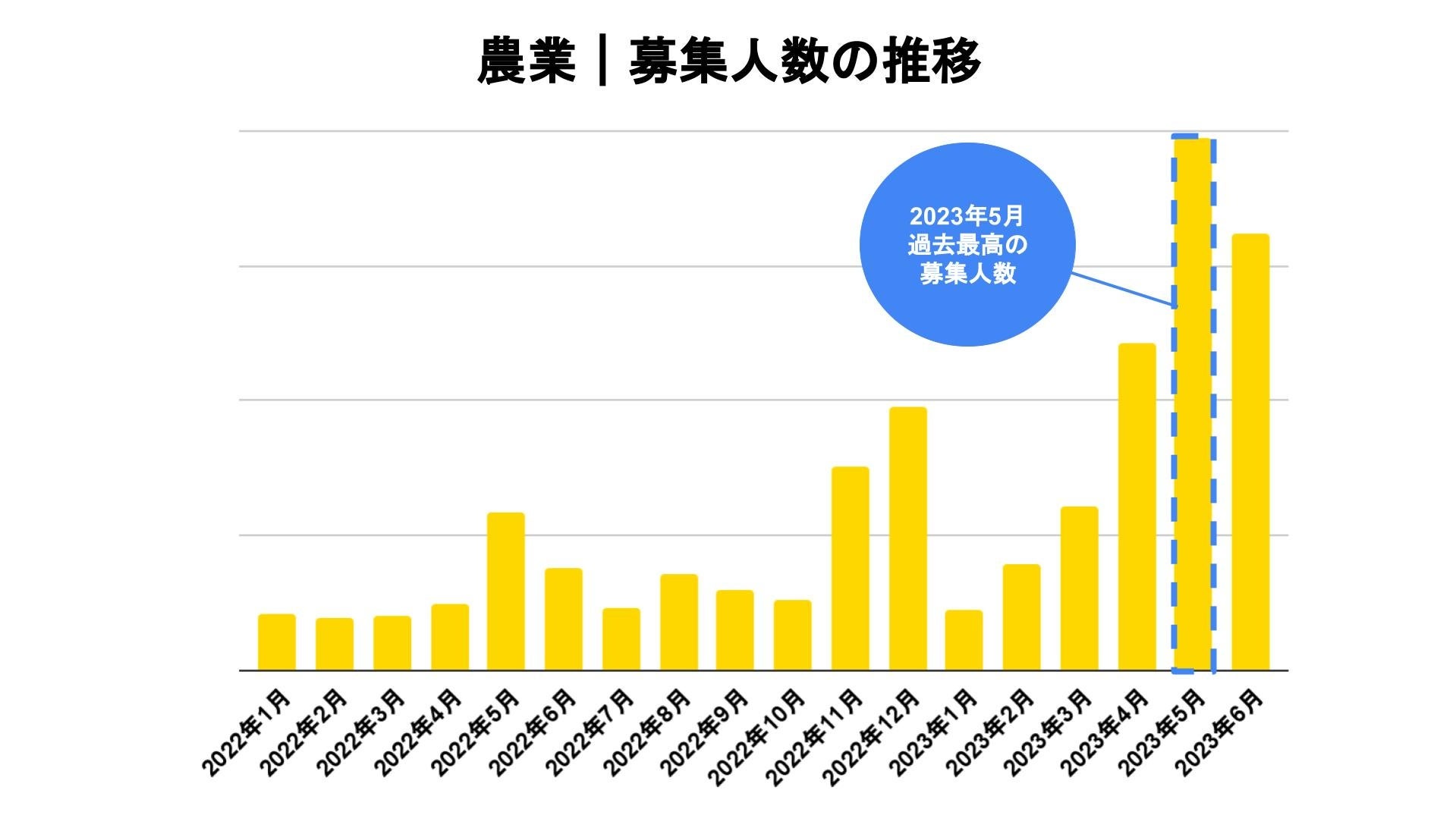 タイミー上に掲載されている農業の仕事の募集人数は増加傾向にあり、2023年5月には過去最高となりました。