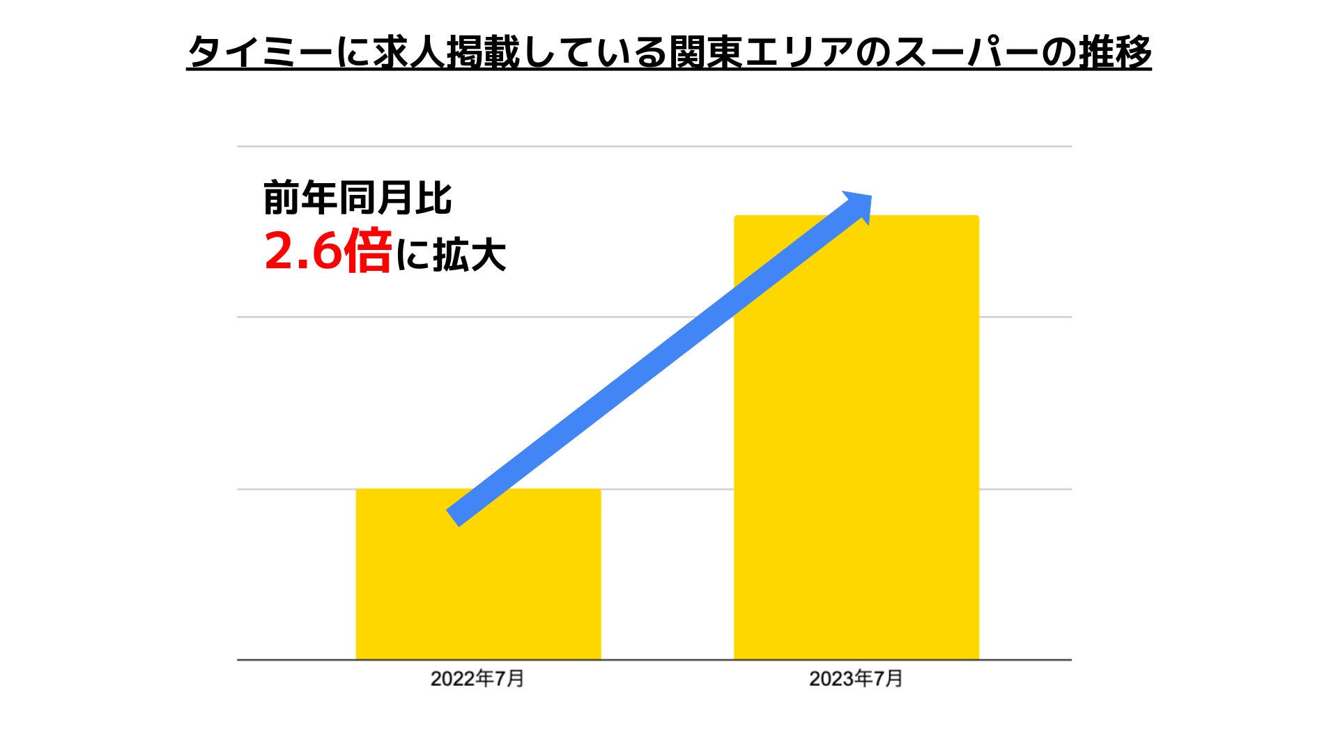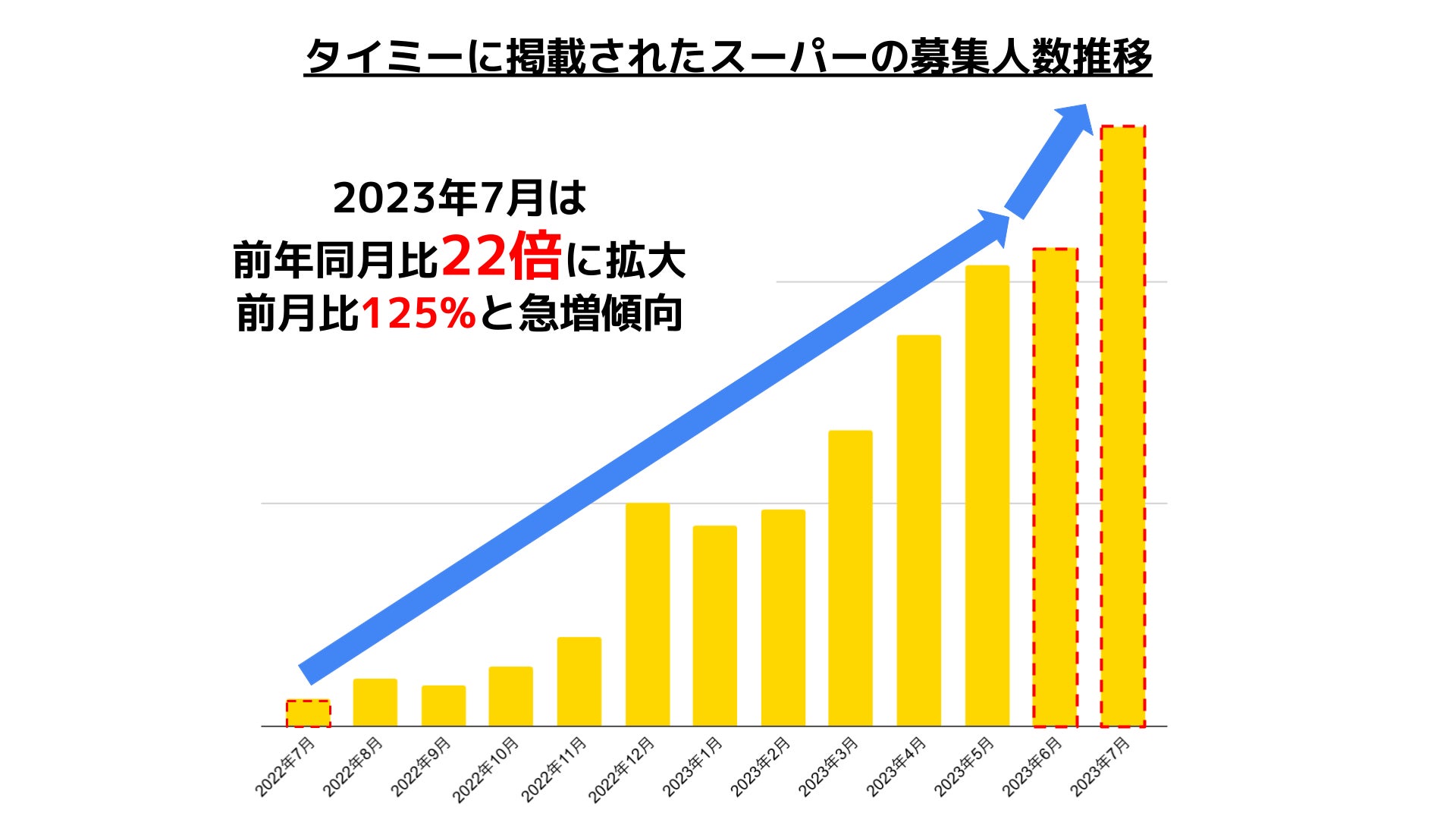 ・スーパーのタイミー募集人数が前年同月比約22倍の過去最高を記録、7月は前月比125%と増加傾向