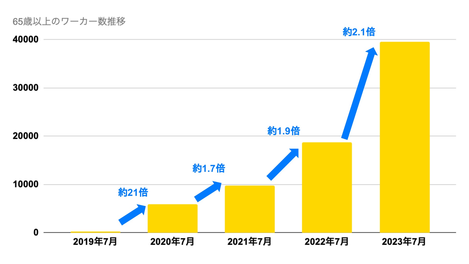 タイミーに登録している65歳以上の働き手は、2023年7月時点で約4万人になっており、2020年以降毎年約2倍のペースで増加を続けており、2019年7月と比較すると、144.6倍という急拡大をしていることがわかりました。