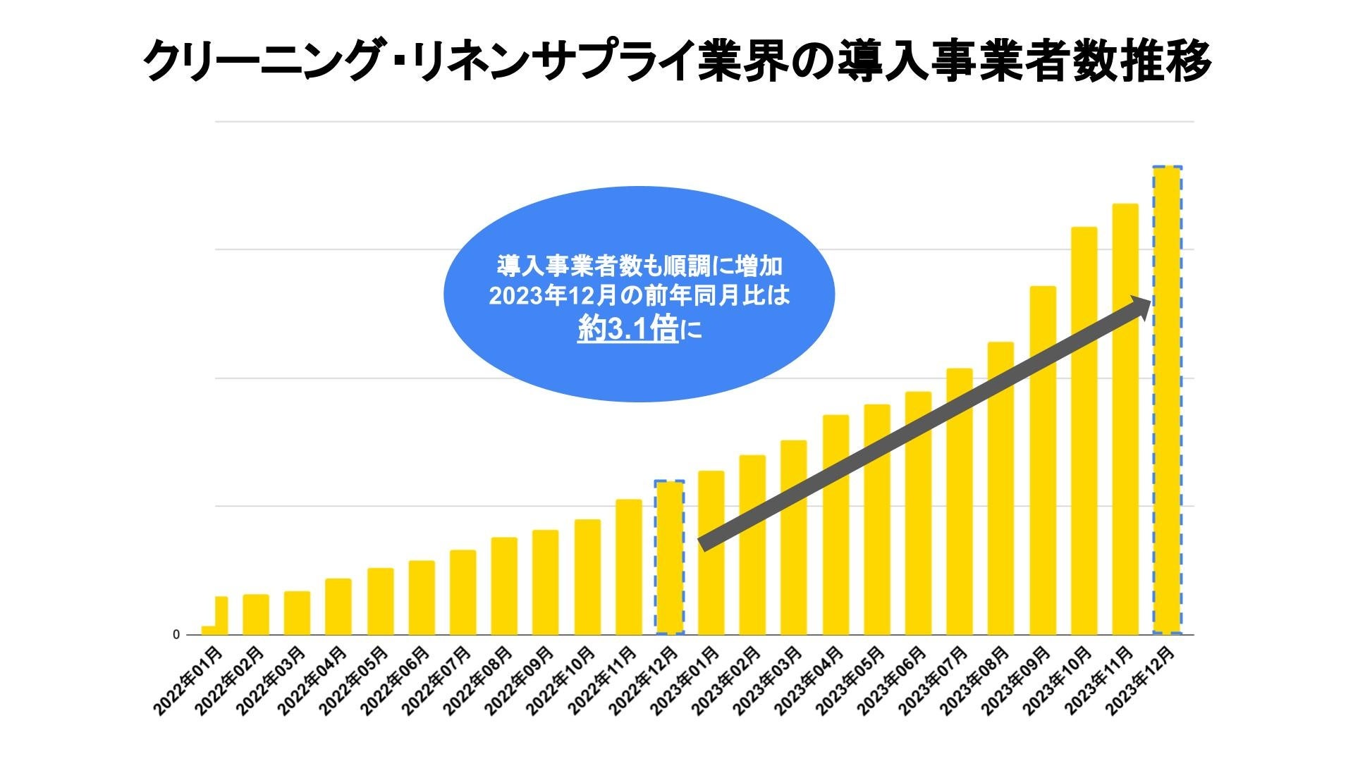 タイミーを導入いただいているクリーニング・リネンサプライ業界の事業者は増加傾向であり、直近の2023年12月と2022年12月の前年同月比は約3.1倍となりました。