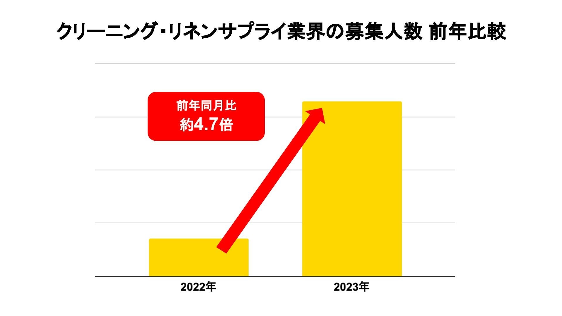 クリーニング・リネンサプライ業界でのスキマバイト利用は増加傾向で、タイミーで求人が掲載されている募集人数は2022年と2023年を比較すると約4.7倍となりました。