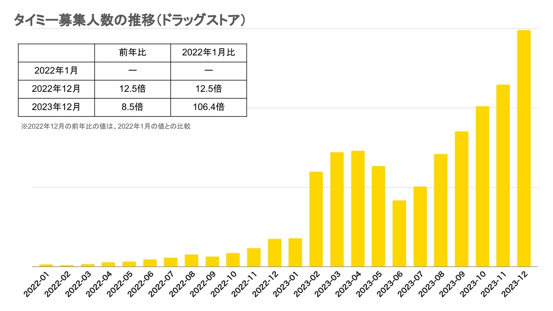 タイミー上のドラッグストアの募集人数が前年比8.5倍、事業所数が前年比6.6倍に急拡大