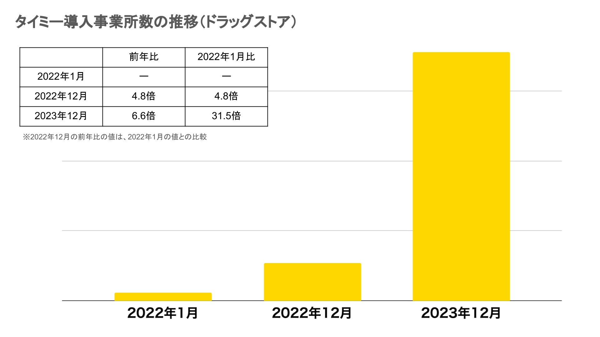 2022年1月以降の「タイミー」上のドラッグストア募集人数推移を見てみると、2022年1月と同年12月比で約12.5倍、2023年12月の前年比で約8.5倍と急拡大しています。また、「タイミー」を導入している事業所数(ドラッグストアの店舗数)も2022年1月と同年12月比で約4.8倍、2023年12月の前年比で約31.5倍と急拡大しています。