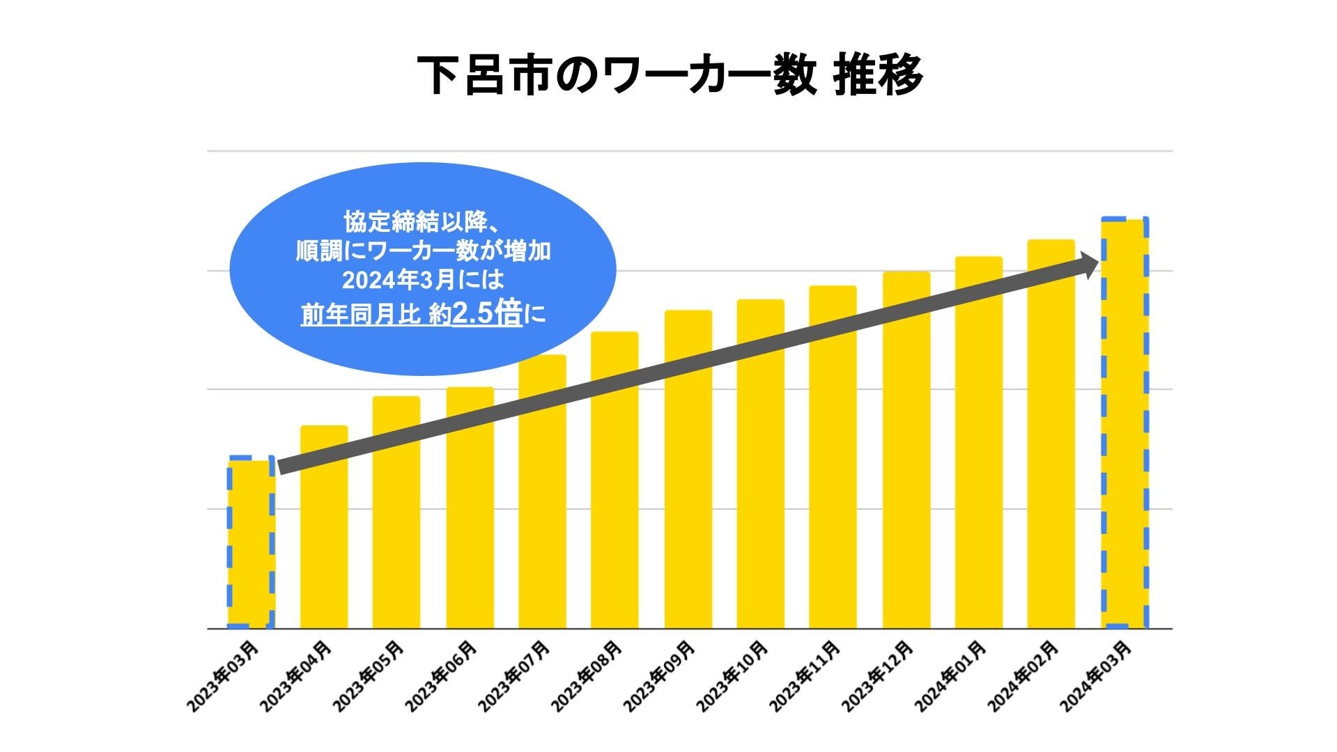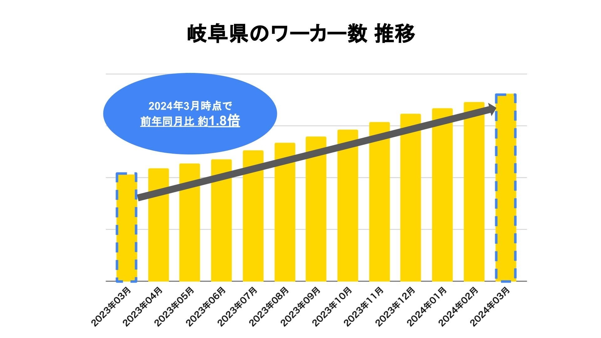2023年3月の協定締結以降、下呂市のワーカー数は順調に増加しており、2024年3月の前年同月比は約2.5倍となりました。岐阜県内のワーカーの増加率を見てみると、2024年3月時点では前年同月比約1.8倍で、県内でも特に下呂市のワーカー数が増加していることがうかがえます。
