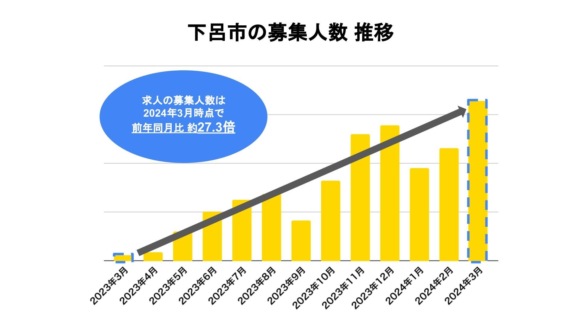 下呂市内でタイミーで掲載されている求人の募集人数も増加しており、2024年3月には過去最高を記録。前年同月比では約27.3倍となりました。