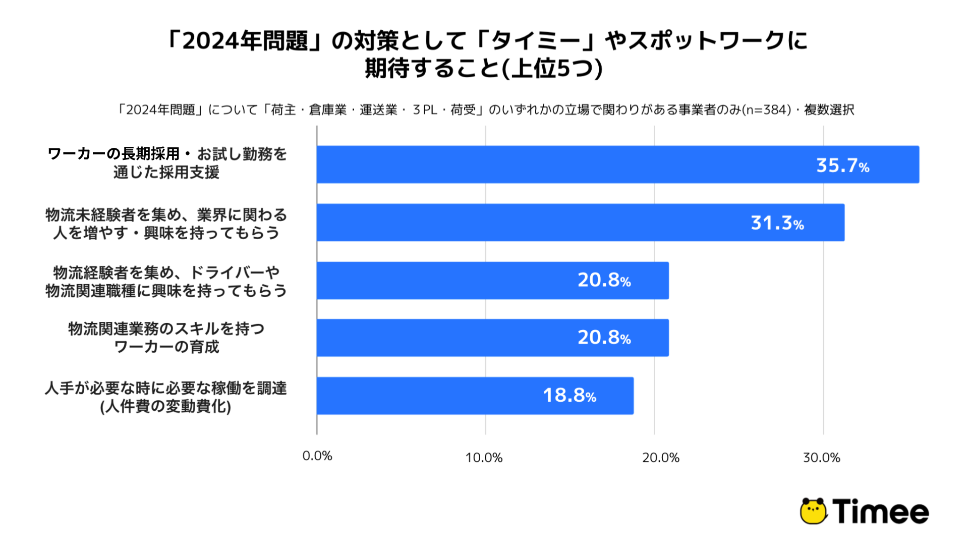 最後に物流2024年問題の対策として「タイミー」やスポットワークに期待することを尋ねたところ、「ワーカーの長期採用・お試し勤務を通じた採用支援」が最多となりました。