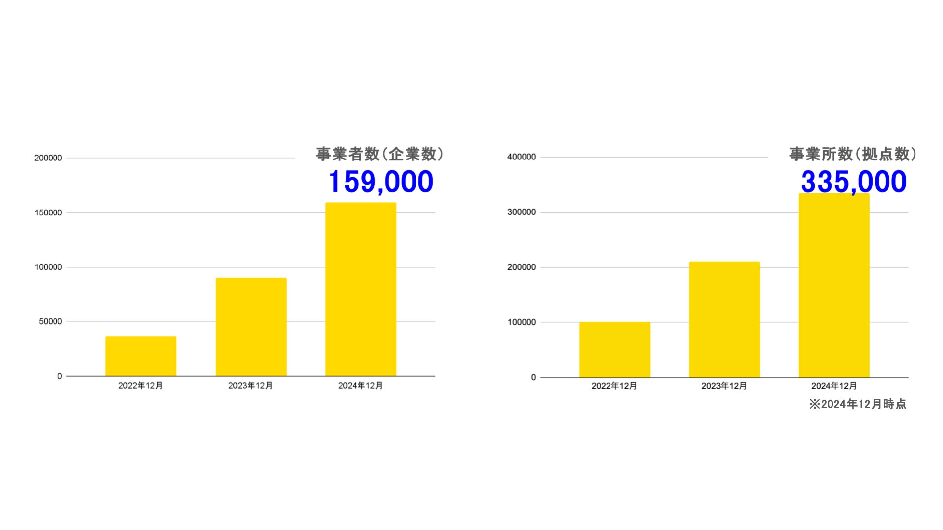 2024年12月時点の登録事業者数(企業数)は、159,000事業者でした。また、登録事業所(拠点数)は、335,000事業所でした。