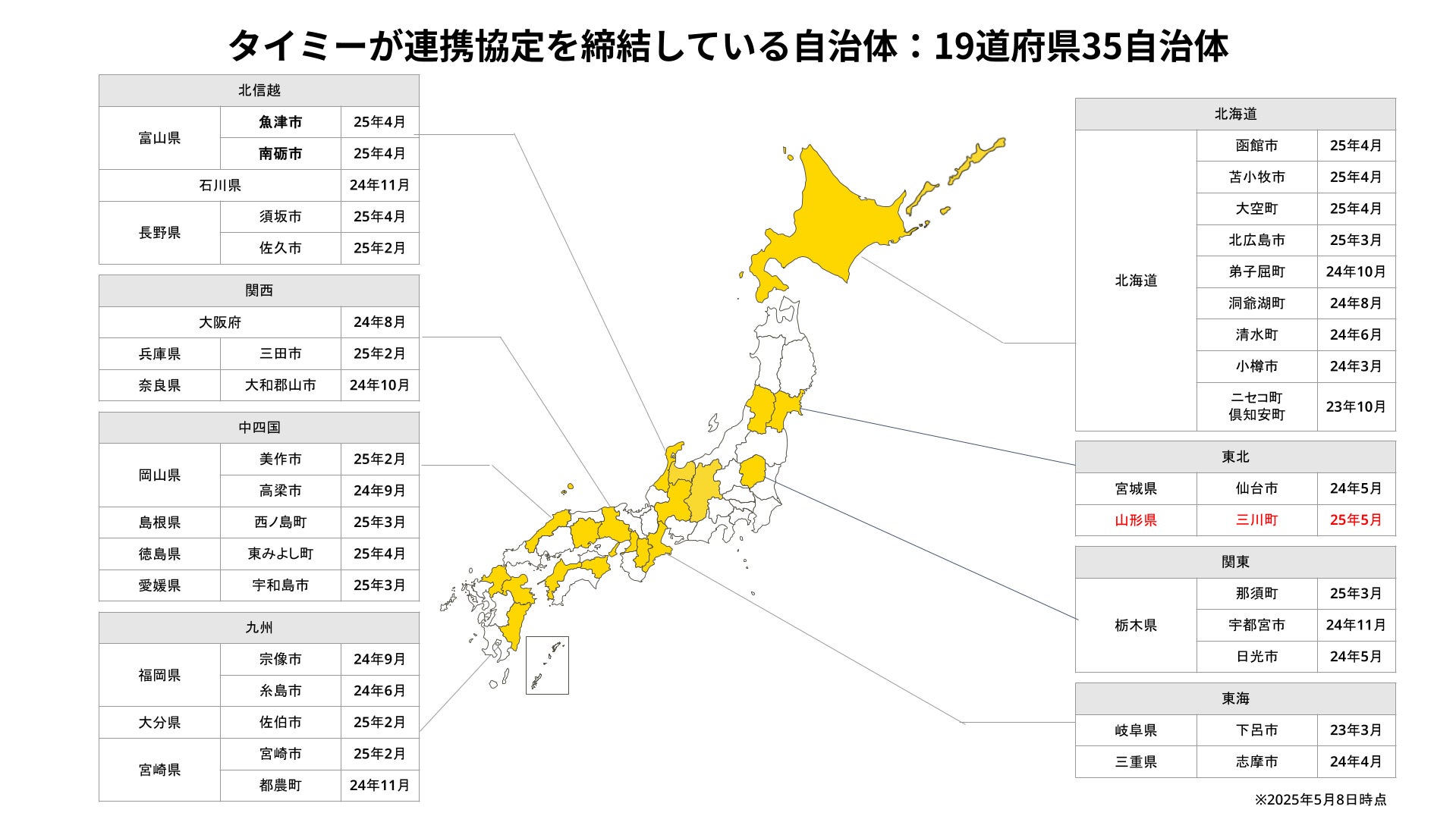 当社はこれまで18道府県・34自治体と連携協定を締結しており、今回の三川町の連携は19道府県・35自治体目となります(※2)。なお、山形県における自治体連携は今回が初となります。