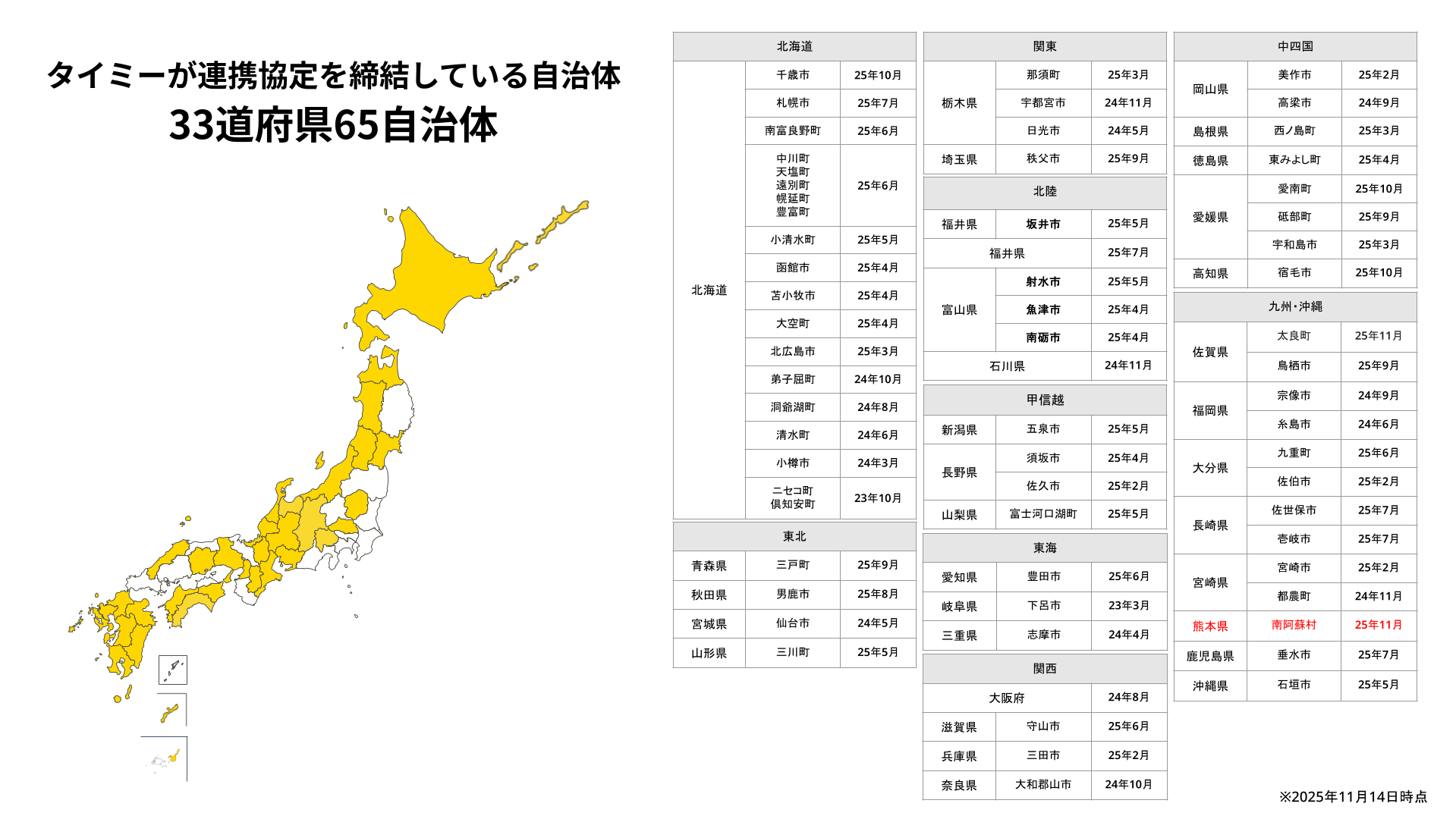 当社はこれまで32道府県・64自治体と連携協定を締結しており、今回の南阿蘇村との連携は33道府県・65自治体目となります(※1)。なお、熊本県内の自治体との連携は今回が初です。