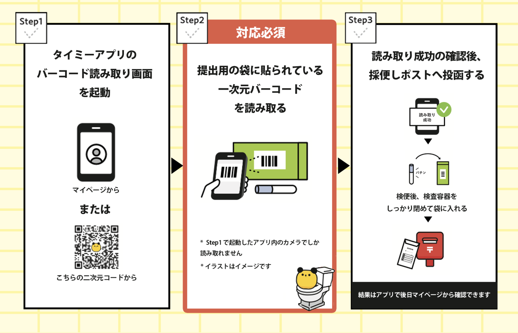 要検便の求人での勤務を希望する働き手は、送付されてきた検便キットに添付の一次元バーコードを読みとります。その後、同封のキットを用いて採便し、ポストに投函します。このバーコードの読み取りが、当社のワーカーデータベースへの検査結果の反映を可能にします。また、この新しい検便機能のスキームについては、特許を取得しました。