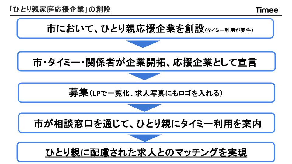 認定企業の求人を可視化し、ひとり親の方々と「ひとり親家庭応援企業(仮)」のマッチングを促進します。これにより、ひとり親の方々の仕事探しのコストを下げるとともに、ミスマッチの防止を目指します。また、このような取り組みを通じて、地域社会全体でひとり親家庭を支える社会的機運を高めることを目指します。