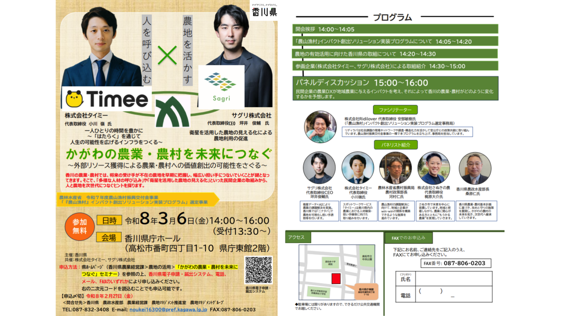 スキマバイトサービス「タイミー」を提供する株式会社タイミー(所在地:東京都港区、代表取締役:小川 嶺)は、香川県(知事:池田 豊人)、サグリ株式会社(代表取締役CEO:坪井 俊輔)と共に、県内の農業事業者および農業関係者等に向けた「かがわの農業・農村を未来につなぐ」セミナーを2026年3月6日(金)に開催いたします。