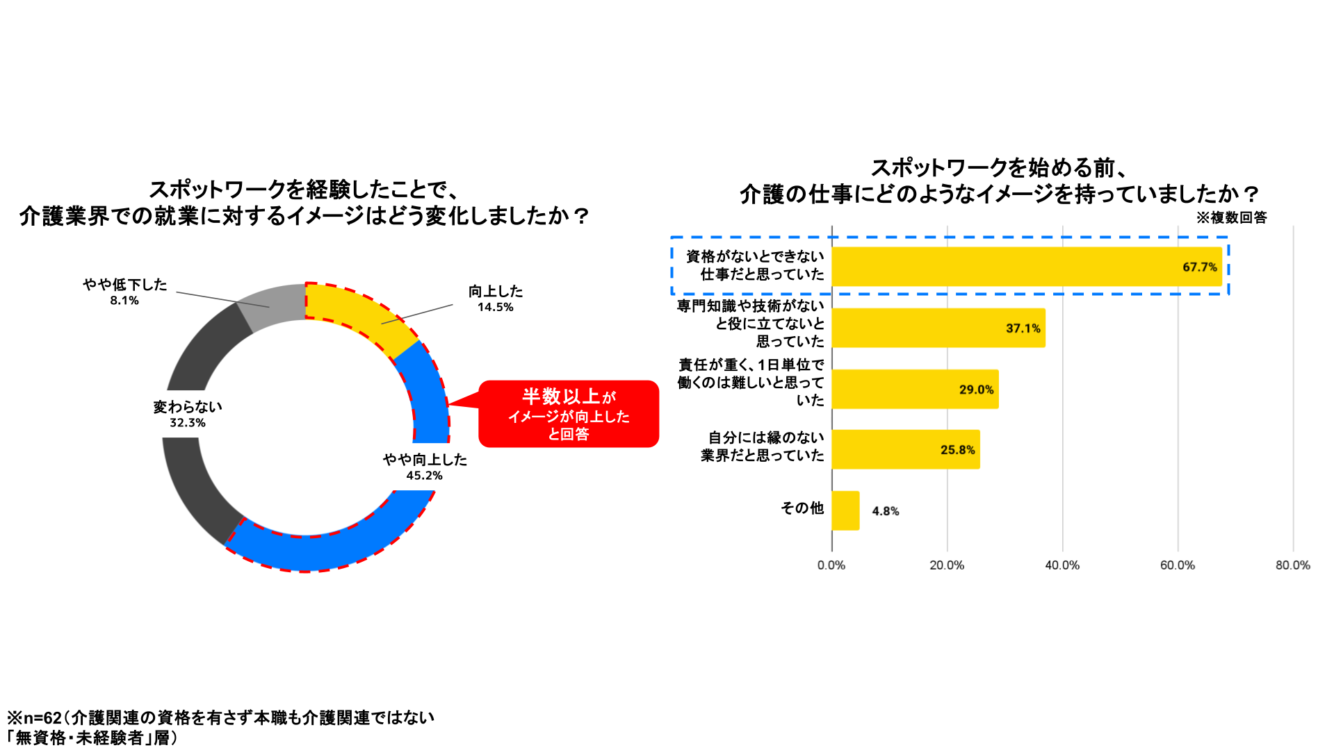 一方で、スポットワークを始める前は介護の仕事が「資格がないとできない仕事だと思っていた」と回答する層は67.7%に上っており、介護業界の仕事はハードルが高いというイメージが就業のボトルネックになっていることがうかがえ、スポットワークでの就業によって、イメージが向上していることがわかります。
