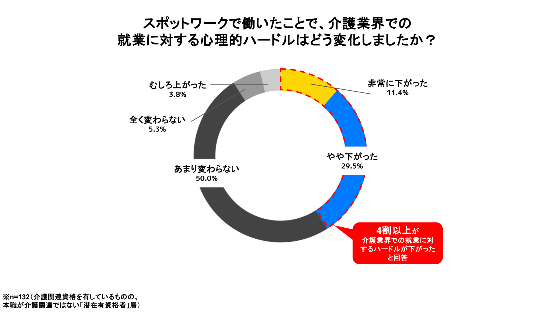 介護関連資格を有しているものの、本職が介護関連ではないいわゆる「潜在有資格者」層に限って質問したところ、4割以上が「スポットワークで働いたことで、介護業界での就業に対するハードルが下がった」と回答しました(「非常に下がった(11.4%)」+「やや下がった(29.5%)」)。