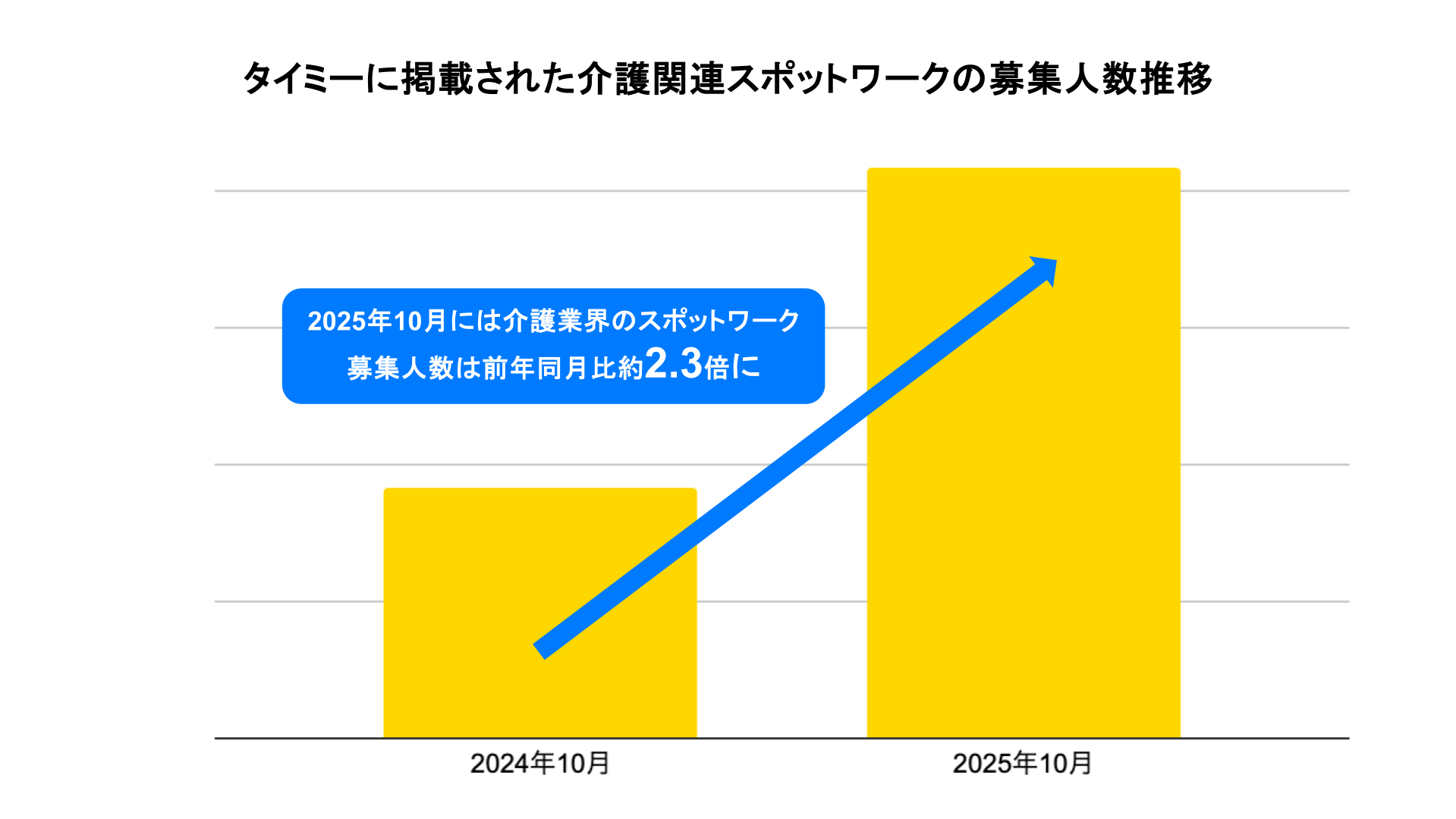 2025年10月時点での介護関連資格を有するタイミー登録ワーカーの数は約51.3万人です。なお、タイミーに掲載された介護関連のスポットワークの募集人数は、2025年10月時点で前年同月比約2.3倍に増加しており、同業界でのスポットワーク需要の高まりが分かります。