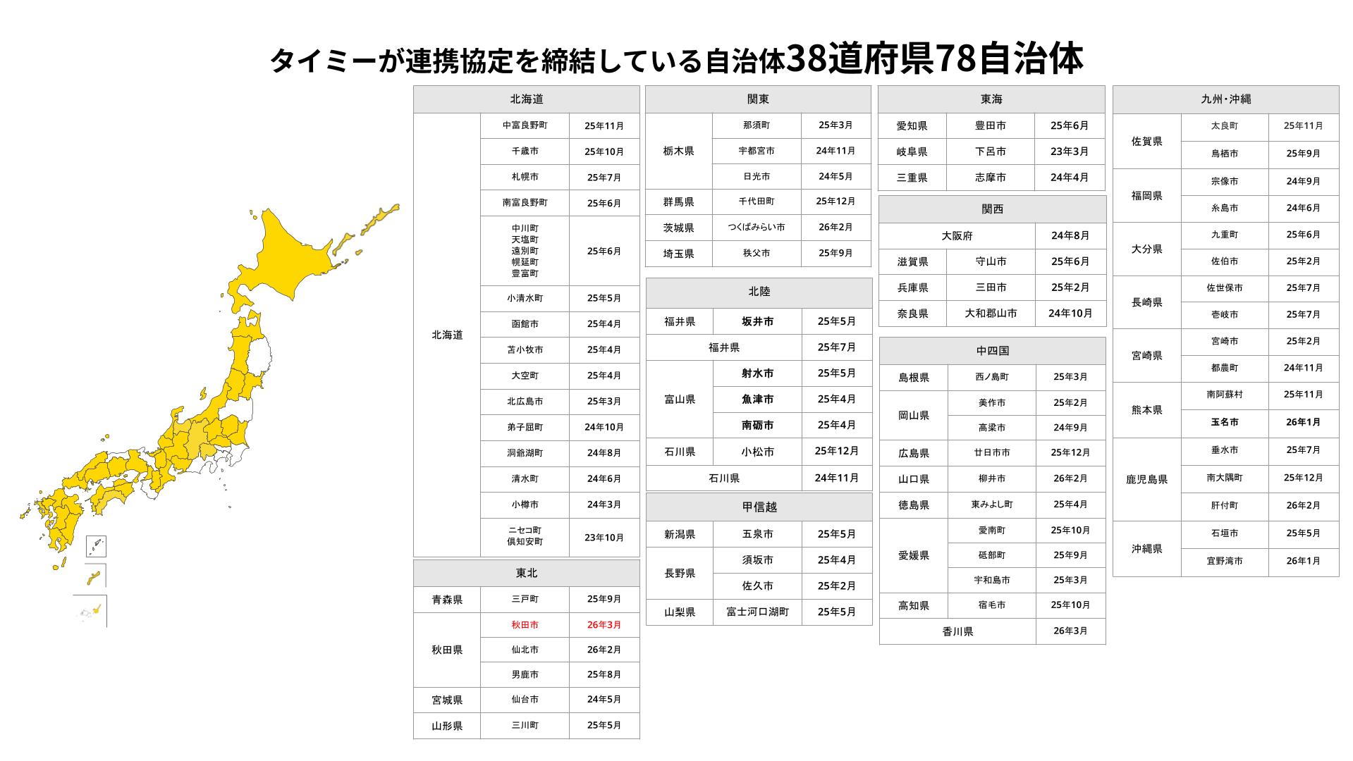 当社はこれまで38道府県・77自治体と連携協定を締結しており、今回の秋田市との連携は38道府県・78自治体目となります(※)。