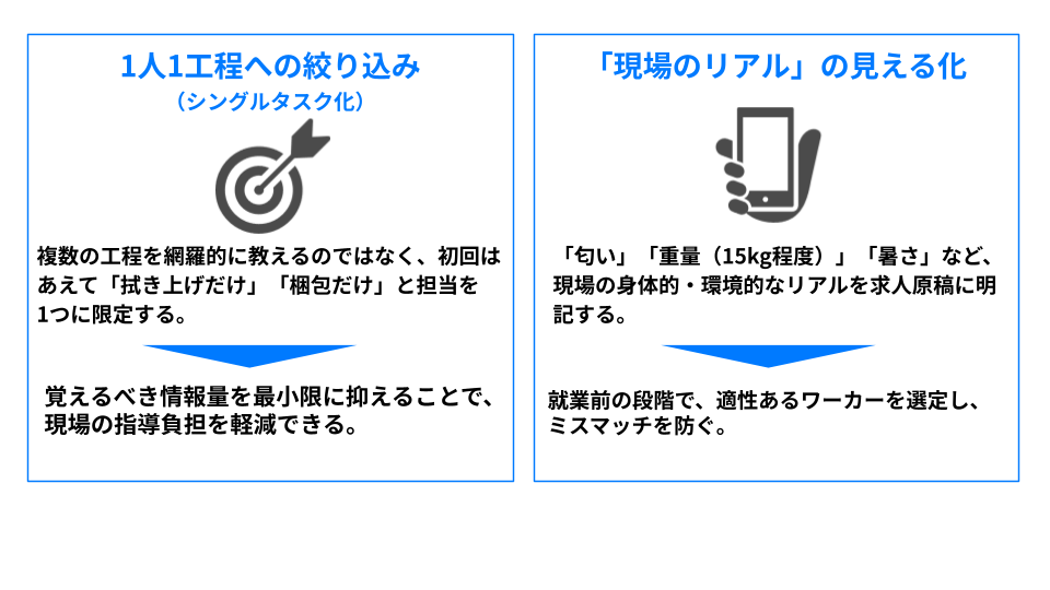 複数の工程を習得させるのではなく、単一のタスクに限定して依頼することで、指導時間を短縮する事例が見られました。