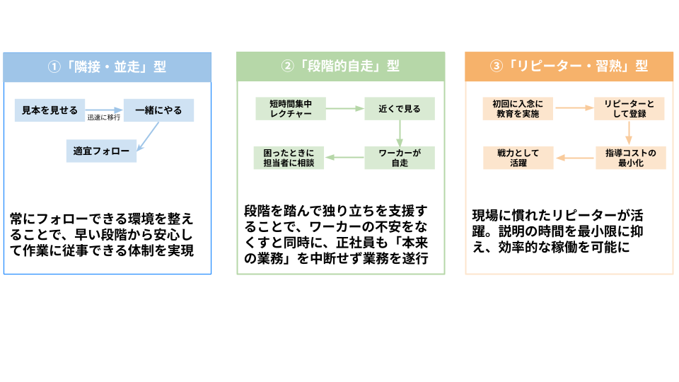 特定のワーカーをリピーターとして確保することで、中長期的に教育コストを低減させる取り組みも見られました。