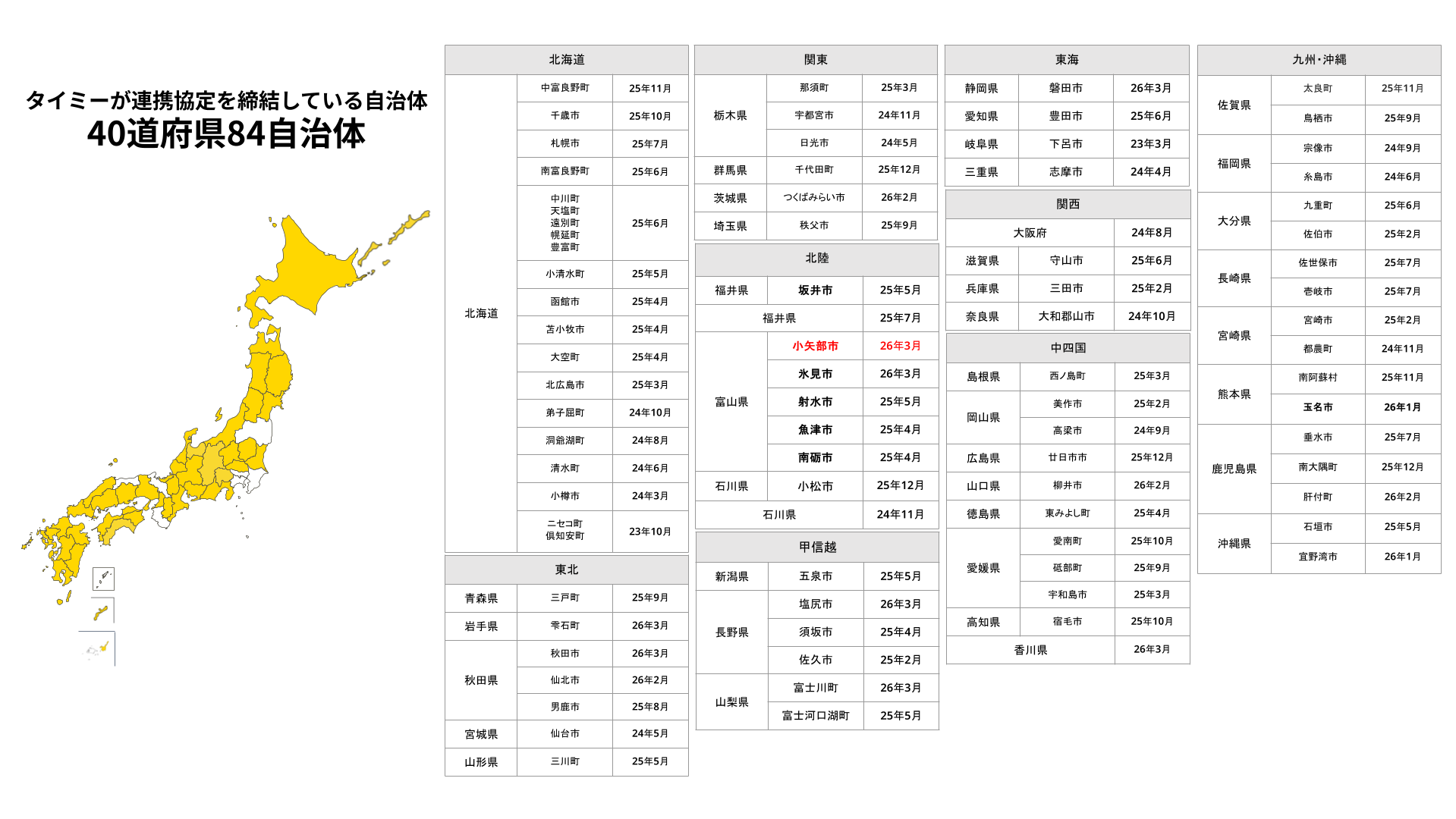 当社はこれまで40道府県・83自治体と連携協定を締結しており、今回の小矢部市との連携は40道府県・84自治体目となります(※2)。