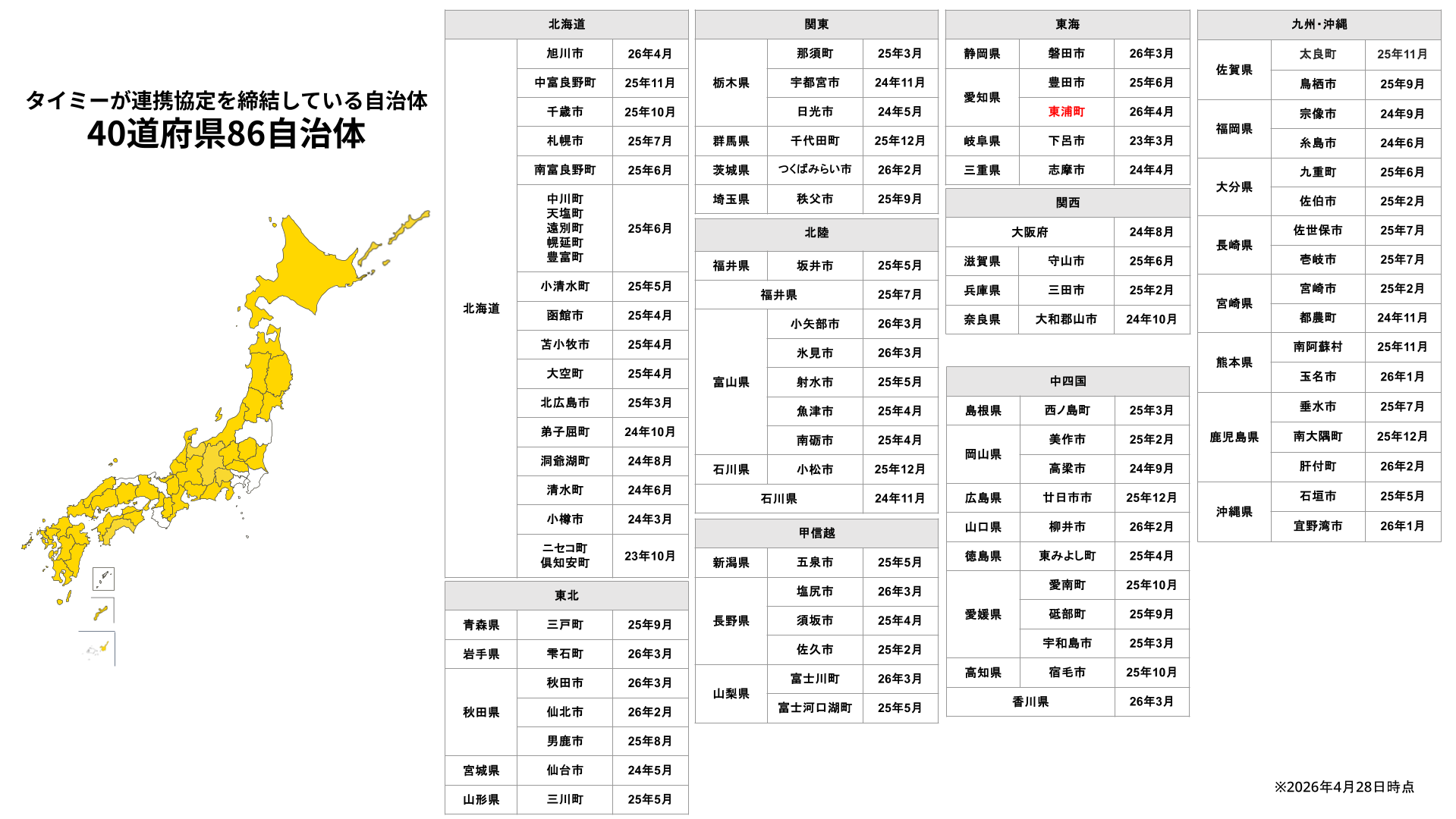 当社はこれまで40道府県・85自治体と連携協定を締結しており、今回の東浦町との連携は40道府県・86自治体目となります(※)。